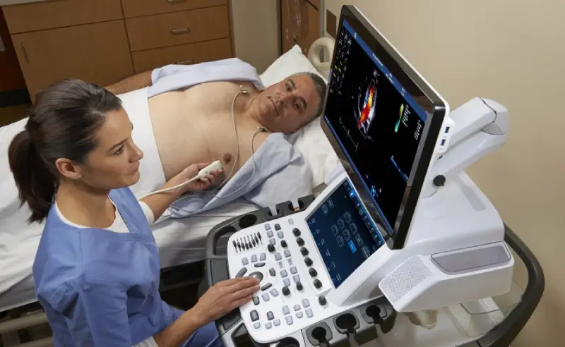A non-invasive medical imaging procedure that uses sound waves to create detailed images of the heart to detect heart conditions.